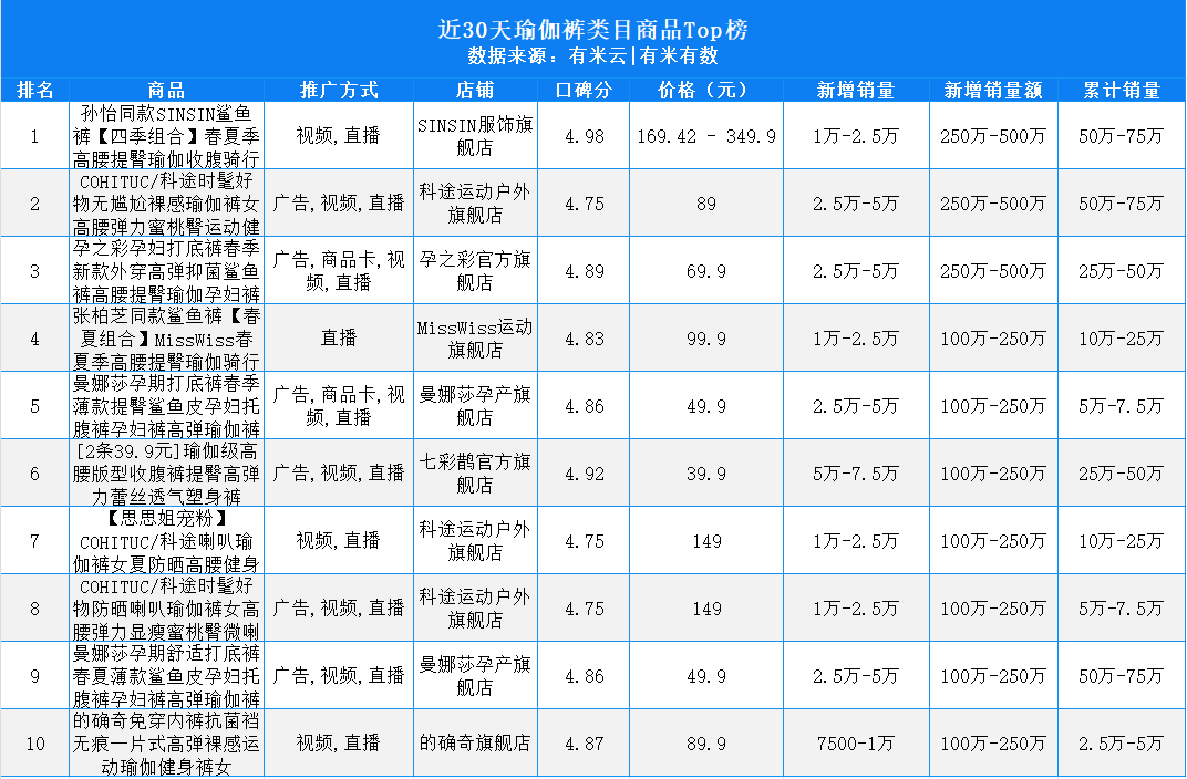 近日,“瑜伽褲賣爆了”登上熱搜后,引發(fā)了廣泛討論。有運動產(chǎn)品電商買手告訴“央視財經(jīng)”,女性運動產(chǎn)品中,瑜伽褲是熱門單品,一個小時就能賣出200多條,瑜伽褲的價格在幾十元到上千元不等。同時,有米云數(shù)據(jù)也顯示,近30天瑜伽褲類目商品Top榜前10的商品,新增銷量額都超過百萬元,足見瑜伽褲的火爆。