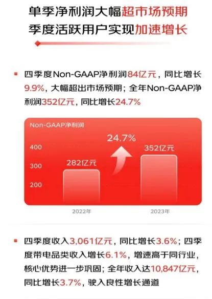 懷著這樣迫切的心情,京東努力奮斗了一年,終于取得了些許成效。最新財報顯示,2023年京東集團四季度收入為3061億元,同比增長3.6%;全年收入達(dá)到10847億元,同比增長3.7%。