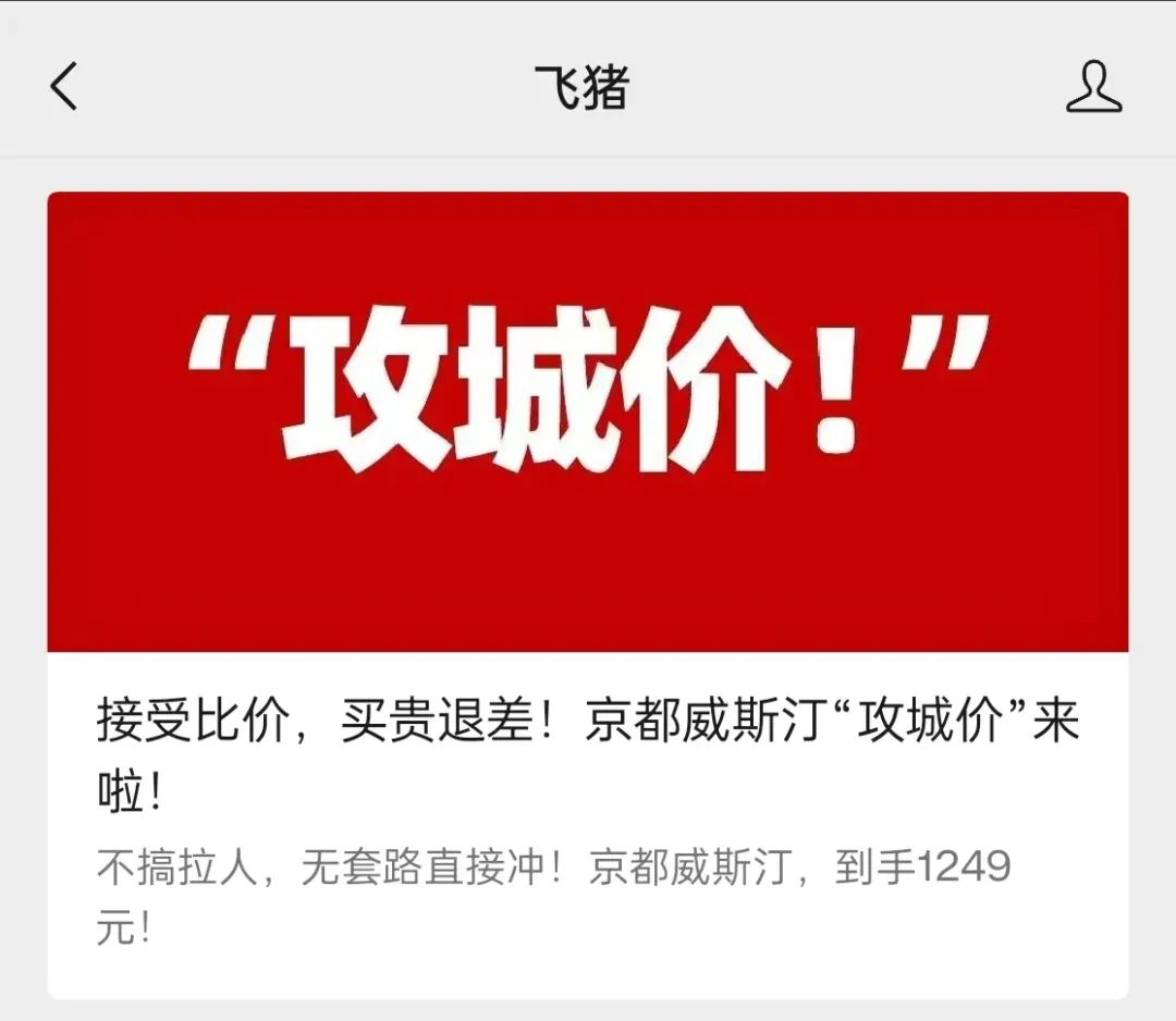不過值得一提的是,就在飛豬推出“攻城價(jià)”之后,京都威斯汀酒店發(fā)布聲明稱,其從未授權(quán)該價(jià)格的產(chǎn)品在飛豬售賣,現(xiàn)已停止飛豬訂單核銷。