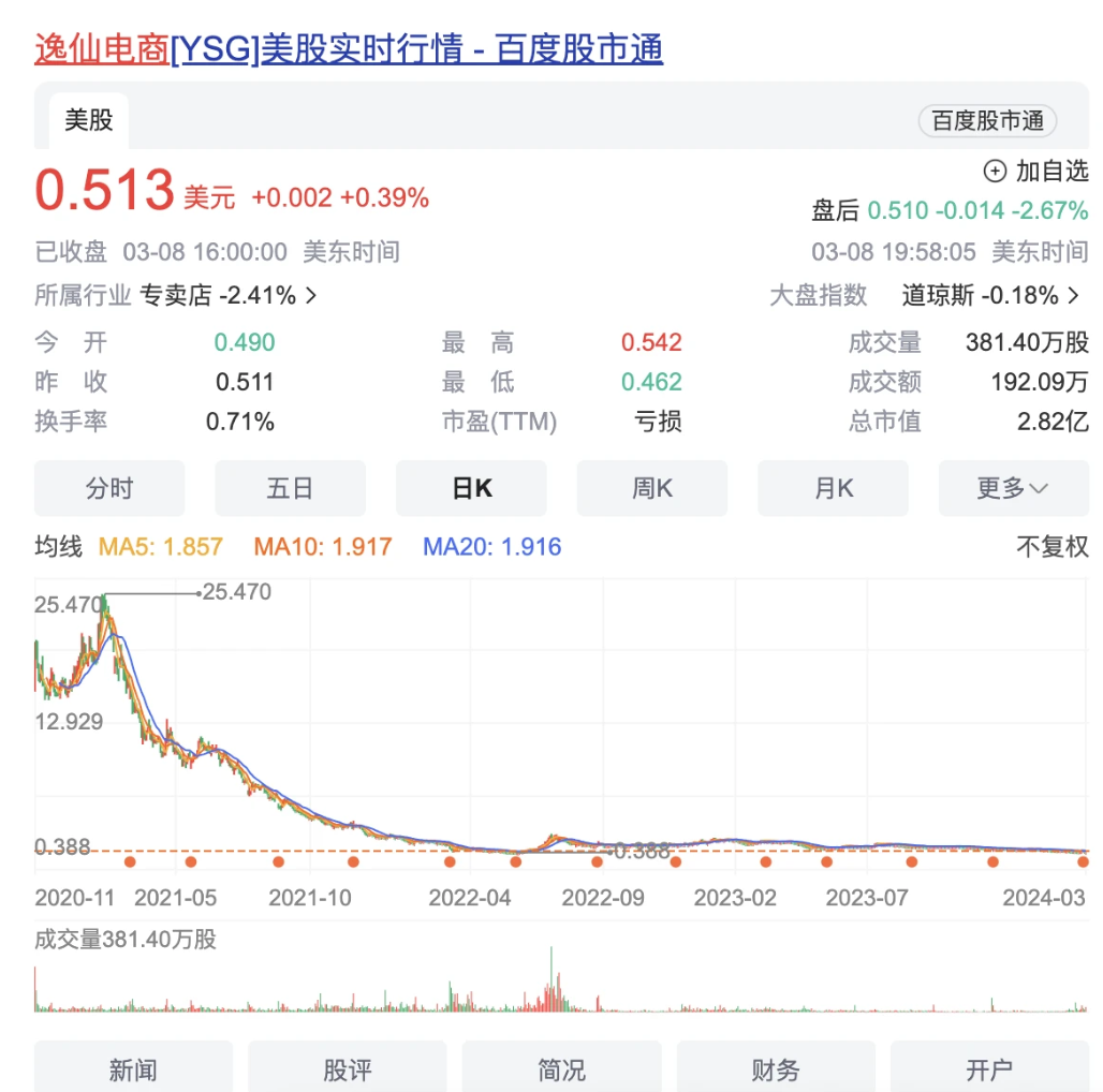 毫無疑問,資本市場對(duì)于逸仙電商的表現(xiàn)是不滿意的,在其公布業(yè)績后,股價(jià)連續(xù)兩天下跌。3月8日止跌后,股價(jià)也僅僅為0.53美元/股,較歷史最高的25.47美元/股,跌去了將近98%。