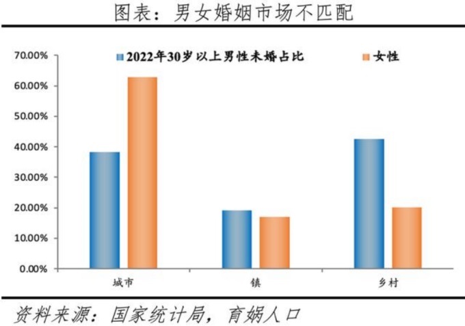 但更值得注意的是:雖宏觀方面性別比有所向好,但微觀(分地域)卻似乎更加嚴峻:城市女多男少、村鎮(zhèn)男多女少。2022年,中國30歲及以上未婚男性有超過60%分布在村鎮(zhèn);未婚女性有超過60%分布在城市。為何性別比差異如此巨大?主要原因二:
