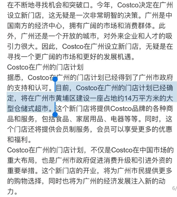 在這張截圖中明確提到了“Costco在廣州的門店計(jì)劃已經(jīng)確定,將在廣州市黃埔區(qū)建設(shè)一座將提供Costco品牌的各種商品和服務(wù)!边@條信息中甚至還把門店的面積都確定了,14萬㎡可以媲美天河區(qū)山姆會(huì)員店。