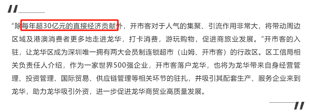 一些城市也在爭(zhēng)搶Costco,積極引入。深圳Costco開業(yè)時(shí)的一份報(bào)告中提到,每年會(huì)有超30億元的直接經(jīng)濟(jì)貢獻(xiàn),很讓人眼紅,同時(shí)會(huì)吸引更多的供應(yīng)商、服務(wù)商在深圳龍華設(shè)立生產(chǎn)基地,進(jìn)而推動(dòng)就業(yè)、產(chǎn)業(yè)、經(jīng)濟(jì)。