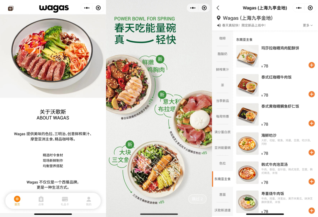 Wagas的選址策略聚焦核心商圈和中高檔寫(xiě)字樓附近,高達(dá)80%都是老客戶(hù),客單價(jià)一直不低,在進(jìn)入Wagas小程序的時(shí)推介的兩款色拉和一款波奇碗,售價(jià)分別為78、85、85元,證明其高端市場(chǎng)的定位。