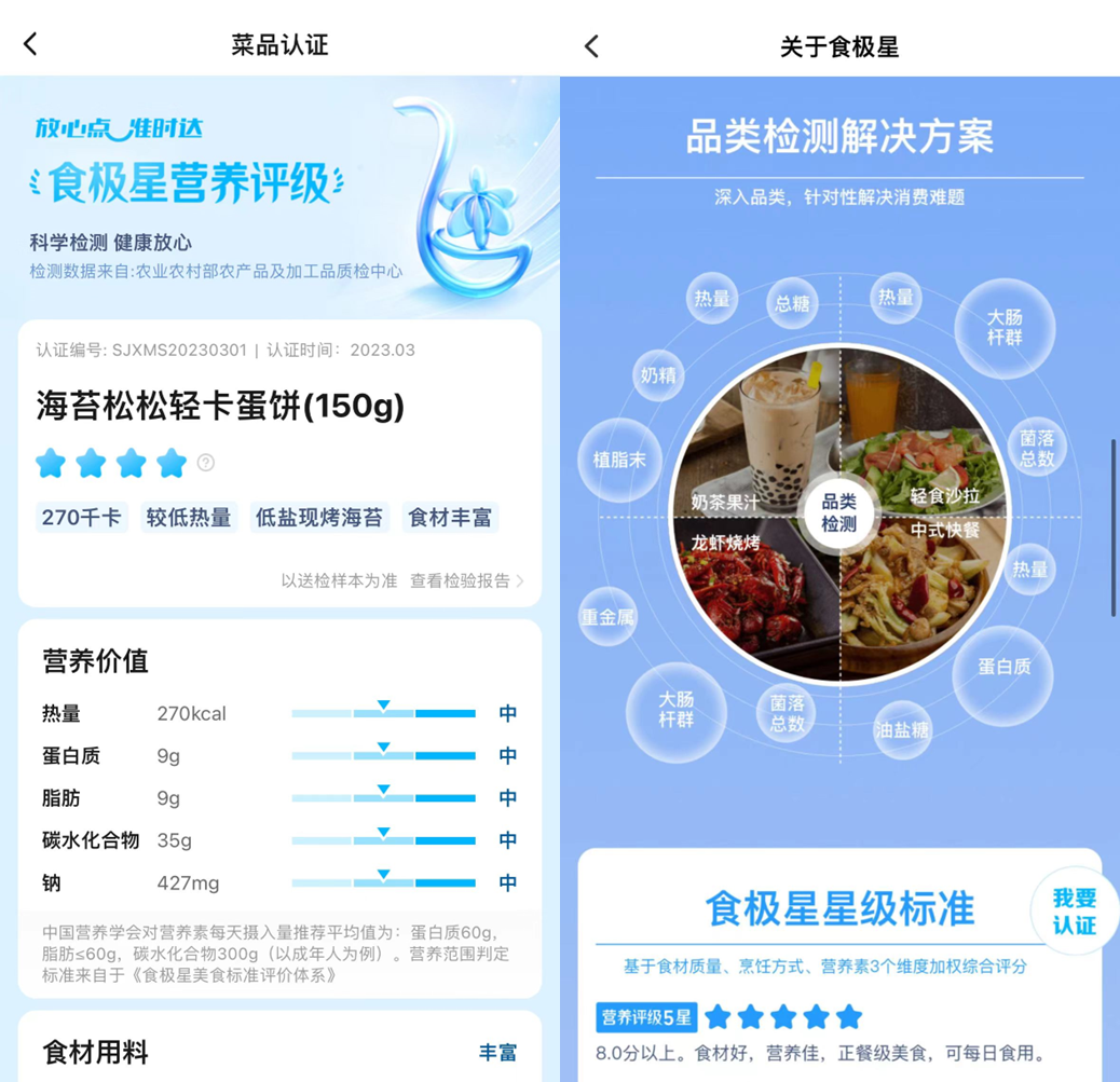 參與行動(dòng)的不只有餐飲品牌們,還有外賣(mài)平臺(tái)。餓了么聯(lián)合食極星將“營(yíng)養(yǎng)評(píng)級(jí)”數(shù)據(jù)化,從餐品的食材用料、食材鮮度、營(yíng)養(yǎng)價(jià)值及保留、烹飪方式、調(diào)味品及添加量、食材供應(yīng)鏈等多維度入手進(jìn)行評(píng)測(cè)。讓餐品營(yíng)養(yǎng)層面有了更客觀(guān)的說(shuō)明。