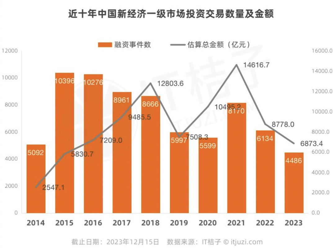 與此同時,在2022年,新消費品牌紛紛“暫!。無數(shù)品牌和投資人關注的融資筆數(shù)和金額都出現(xiàn)腰斬。2022上半年新消費賽道241起融資,融資規(guī)模僅過百億,僅為2021年的15%。最近,IT桔子數(shù)據(jù)顯示,2023年中國新經濟一級市場投資交易事件數(shù)量有4486起,較2022年下降了27%,創(chuàng)下了2015年以來的最低點。
