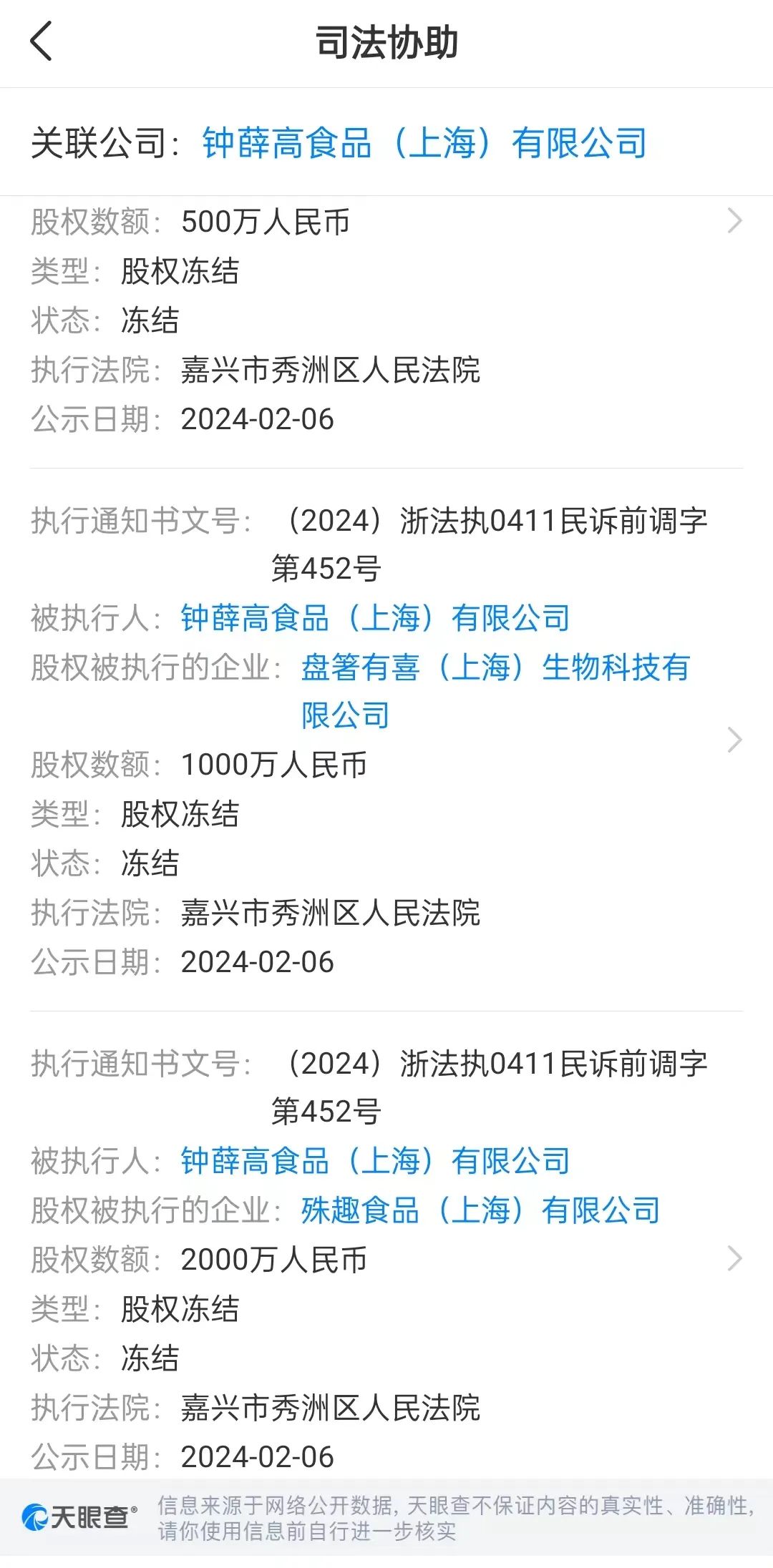天眼查顯示,鐘薛高食品(上海)有限公司所持3500萬(wàn)股權(quán)被凍結(jié),涉及旗下3家公司。目前鐘薛高官方微信公眾號(hào)、官方微博、小紅書(shū)均已停更三個(gè)月以上。