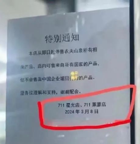 ▲常州兩家711停售農(nóng)夫山泉產(chǎn)品通知。圖片源自網(wǎng)絡(luò)