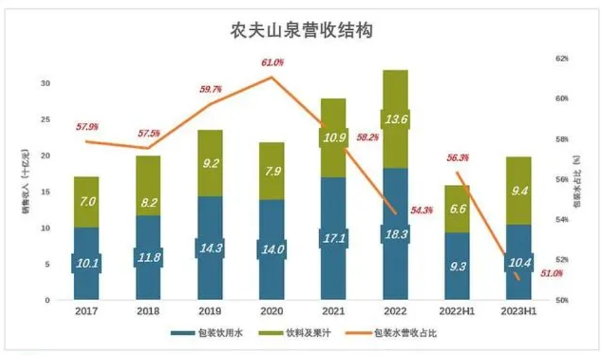 截至2023年上半年,農(nóng)夫山泉的飲料板塊營(yíng)收66億,在總收入占比顯著上升,達(dá)到39.8%;茶飲料、功能飲料、果汁三項(xiàng)業(yè)務(wù)利潤(rùn)為37.6億,在公司總利潤(rùn)占比達(dá)到48.7%,而包裝飲用水貢獻(xiàn)了49.2%的利潤(rùn)。