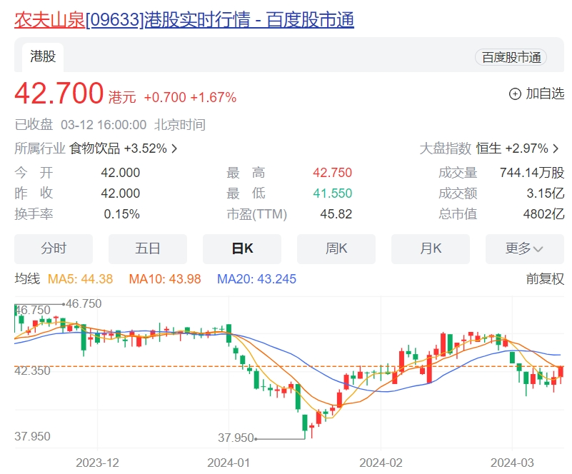 3月12日,農(nóng)夫山泉股票開(kāi)盤(pán)下探后翻紅,股吧有人留言:“今天紅盤(pán),在座的都有責(zé)任!