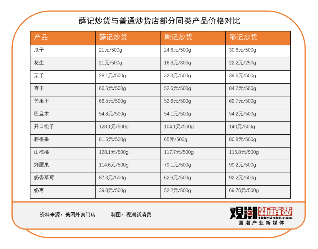 一位薛記炒貨店的店員也對觀潮新消費表示,在給產(chǎn)品定價時不光會考慮原材料成本,租金、裝修、設(shè)備、水電、人工等雜七雜八的費用都會包含在內(nèi)。