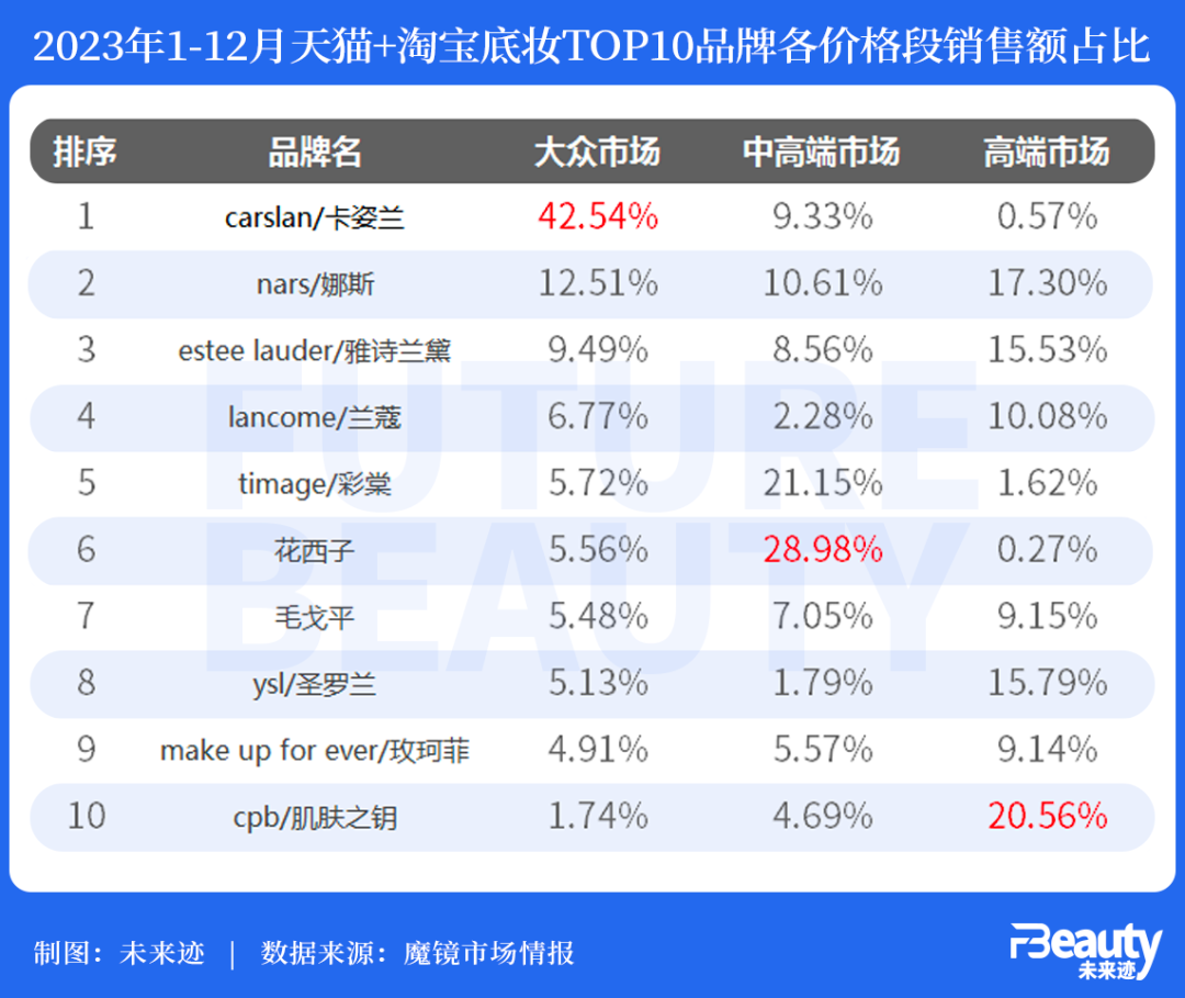 從2023年1-12月淘寶+天貓底妝TOP10品牌的銷售情況來看,280元以上的高端市場,仍以外資品牌為主,在前十中的市場份額占比達到84%。