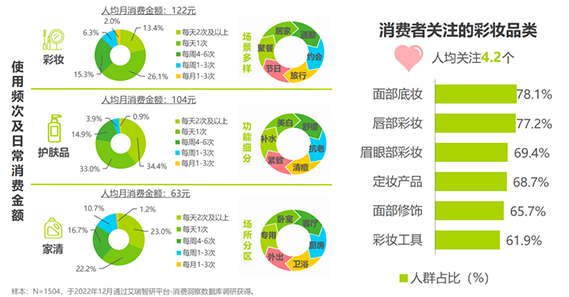 疫情后,隨著社交生活的增加消費者對彩妝的需求正在不斷增長,人均日常關注品類已經超過4個,而面部底妝產品是消費者最關注的品類。并且39.5%的消費者會每天使用1-2次彩妝產品,且人均月消費金額遠高于護膚品和家清產品。