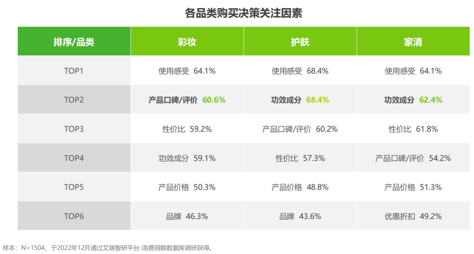 更值得注意的是,和護膚品、家清產品相比,消費者消費彩妝時的購買決策關鍵因子要更為多元。艾瑞咨詢的調研結果顯示:消費者購買護膚品的購買決策關鍵因子為“使用感受”“功效成分”和“產品口碑”;購買家清產品的購買決策關鍵因子為“使用感受”“功效成分”和“性價比”;但彩妝的購買決策關鍵因子為“使用感受”“產品口碑”“性價比”“功效成分”4個。
