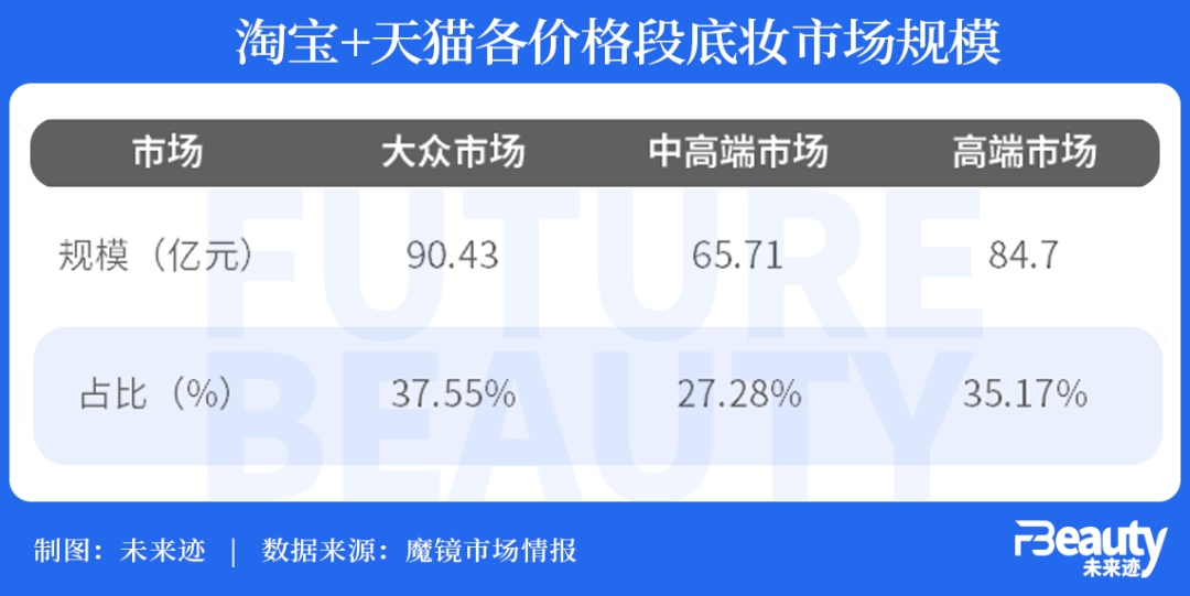 根據魔鏡市場情報對底妝市場的價格帶劃分,均價140元及以下的價格帶為大眾市場,140元-280元之間的為中高端市場,280元以上的為高端市場。按銷售額來計算,底妝市場整體呈現“M”型結構,大眾市場和高端市場占比合計超過70%。但大眾市場仍然是最大的板塊,占比達到37.55%。