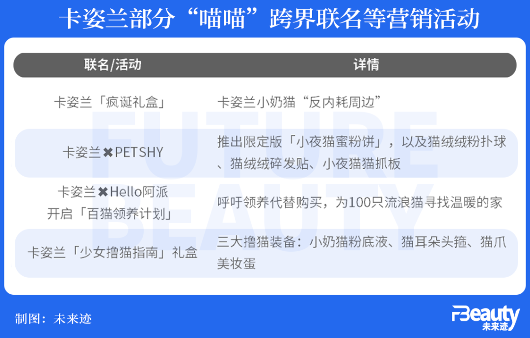 而通過梳理發(fā)現,近年來卡姿蘭多次發(fā)起與“貓”相關的營銷活動。如去年年底,卡姿蘭特別推出雙旦限定包裝——卡姿蘭瘋誕禮盒,內含卡姿蘭小奶貓的“反內耗周邊”,契合當下年輕人圈層流行的“發(fā)瘋文化”。還在官方微博發(fā)起小奶貓同款姿勢召集,吸引了不少愛寵人士的參與。此外還有與寵物用品品牌的聯名合作,以及同小動物慈善機構共同發(fā)起的愛心領養(yǎng)活動等。