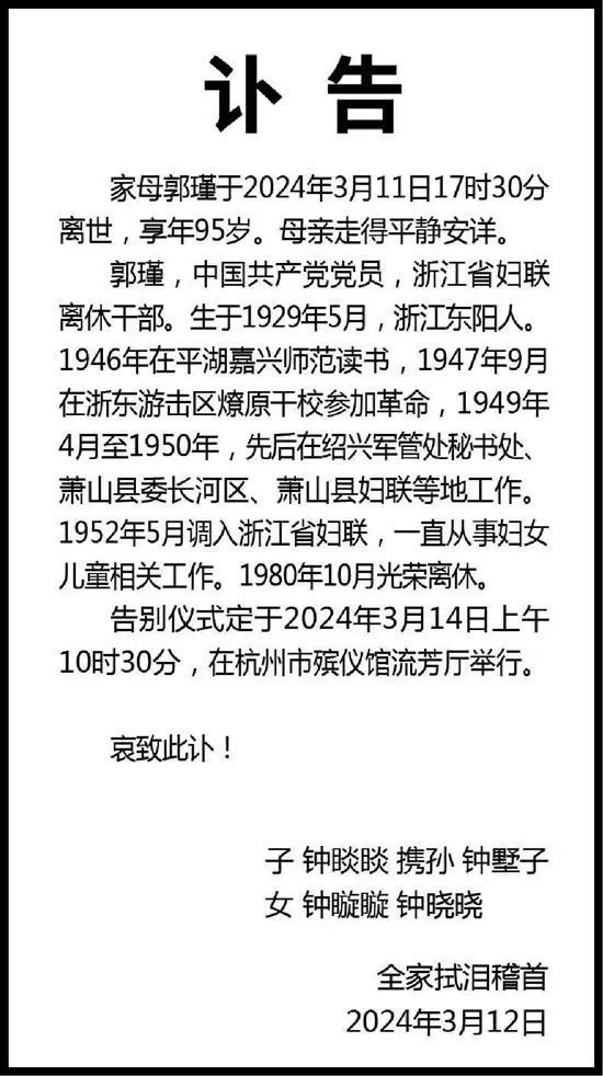 3月13日,錢江晚報第5版刊登的訃告顯示,鐘睒睒之母郭瑾于2024年3月11日17時30分離世,享年95歲。