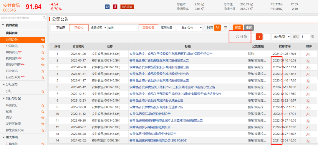 據(jù)國際金融報不完全統(tǒng)計,2020年至今,安井食品共披露8條有關(guān)“股東減持股份結(jié)果”的公告,涉及公司控股股東福建國力民生科技發(fā)展有限公司(下稱“國力民生”)、董事長劉鳴鳴、董事兼總經(jīng)理張清苗、董秘梁晨、財務(wù)總監(jiān)唐奕、副總經(jīng)理黃清松、副總經(jīng)理黃建聯(lián),累計減持?jǐn)?shù)量超3500萬股,減持總金額超48億元,而所有公告給出的減持原因均為“個人/自身資金需求”
