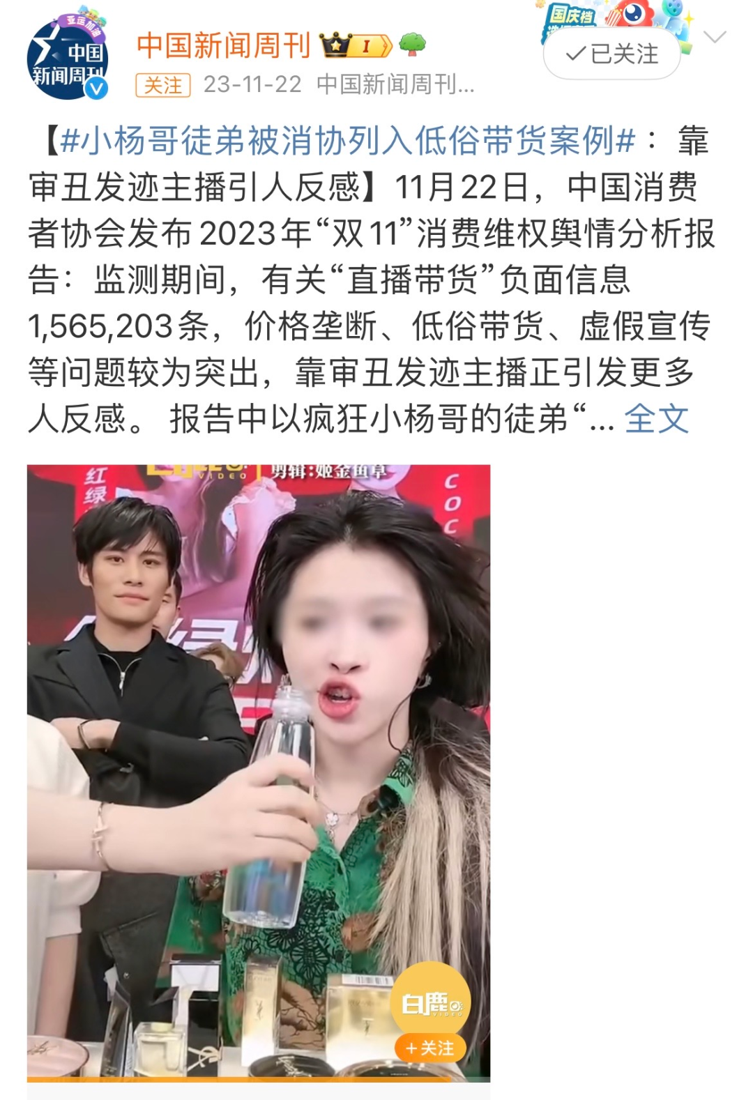 再來看,低俗帶貨也引發(fā)熱議。在中國(guó)消費(fèi)者協(xié)會(huì)發(fā)布的《2023年“雙11”消費(fèi)維權(quán)輿情分析報(bào)告》中,提到知名網(wǎng)紅小楊哥的徒弟“紅綠燈的黃”靠審丑發(fā)跡令人反感,因此被消協(xié)列入低俗帶貨案例。