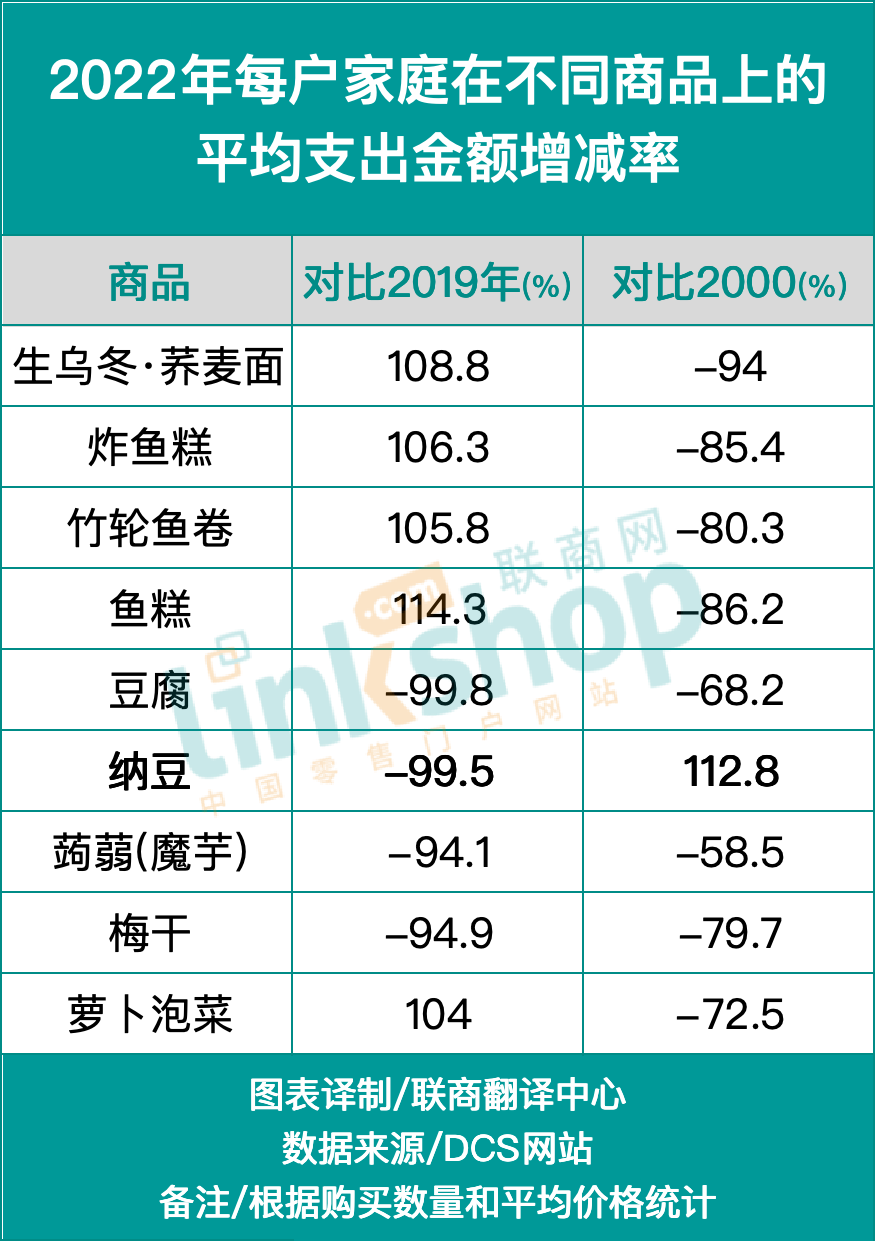 在不同類別的日配商品方面,下圖將2022年每戶家庭的平均支出金額,與3年前的2019年和22年前的2000年進(jìn)行了比較。數(shù)據(jù)顯示,與2000年相比,大部分日配商品的支出金額都出現(xiàn)了下降。蒟蒻(魔芋)的支出減少了近一半,豆腐減少了68.2%,泡菜類則減少了約72.5%。唯一的例外是納豆,支出金額增長了112.8%。