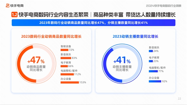 從場(chǎng)域經(jīng)營(yíng)上看,快手電商數(shù)碼行業(yè)商品種類和帶貨達(dá)人數(shù)量實(shí)現(xiàn)雙增長(zhǎng),2023年數(shù)碼行業(yè)動(dòng)銷商品數(shù)量同比增長(zhǎng)47%,分銷主播數(shù)量同比增長(zhǎng)41%,泛貨架占數(shù)碼行業(yè)GMV整體的24%,影音娛樂、電腦整機(jī)/配件等在泛貨架場(chǎng)景GMV同比增速均超100%。