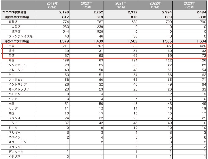 截至2023年8月底,優(yōu)衣庫各市場門店數(shù)