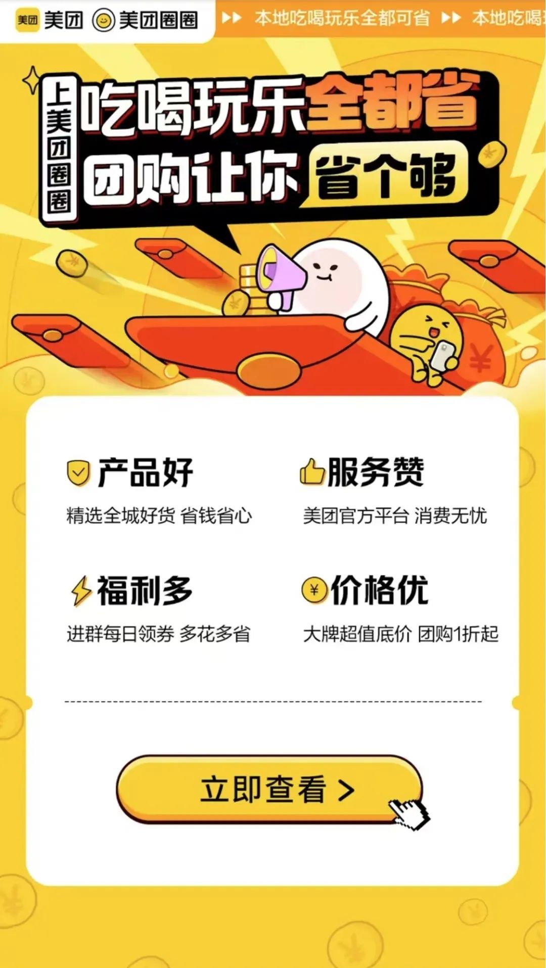 受到抖音的持續(xù)沖擊,美團迅速作出反應,推出了“特惠團購”和“特價團購”兩大優(yōu)惠活動,并借助美團圈圈平臺,以超低價商品為賣點,積極吸引達人進行分銷。