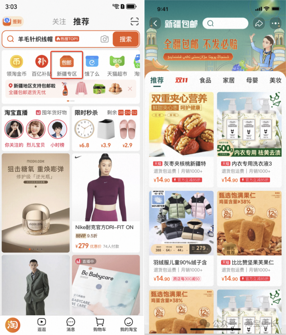 有媒體報道,淘寶淘已面向部分新疆用戶灰度測試“新疆包郵”頻道,或?qū)⒃诮臻_啟新疆全面包郵計劃。