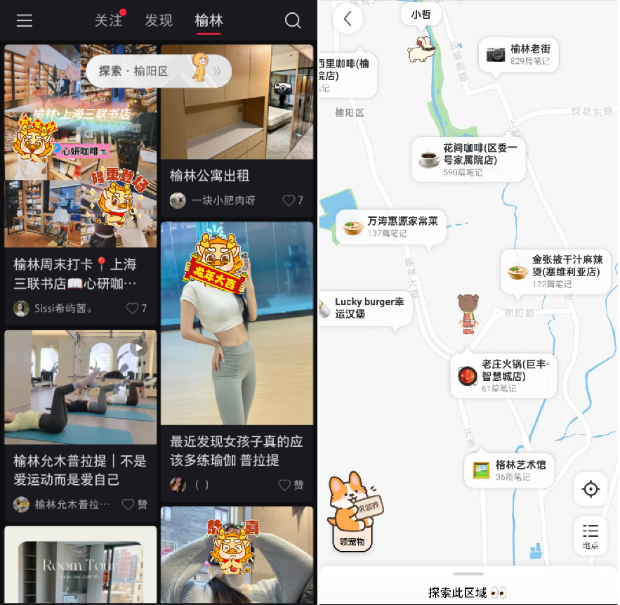 春節(jié)期間,小紅書將“附近”搬到一級入口,用戶點開“附近”地圖后,可以清晰地看到附近吃喝玩樂的商家、相關筆記、直播和群聊等內(nèi)容。目前最新版本中,這一功能隱藏在所在地標簽頁下。