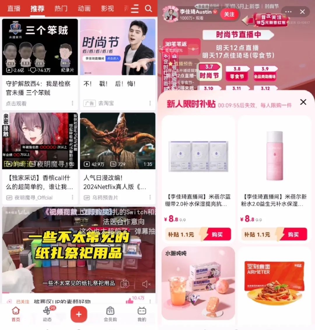 不久前,億邦動(dòng)力曾獨(dú)家披露,B站App首頁出現(xiàn)了淘寶直播的廣告小卡。點(diǎn)擊可直接進(jìn)入李佳琦的淘寶直播間,直播間頁面下方自動(dòng)出現(xiàn)“新人限時(shí)補(bǔ)貼”產(chǎn)品,關(guān)閉該彈窗后便跳出領(lǐng)取新客紅包的頁面。