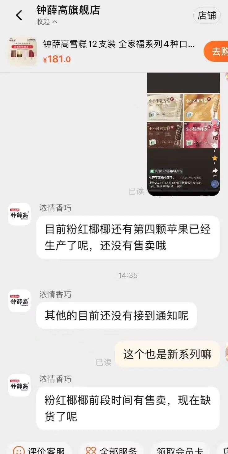圖注:鐘薛高官方旗艦店客服回應(yīng)新品上新相關(guān)事宜。