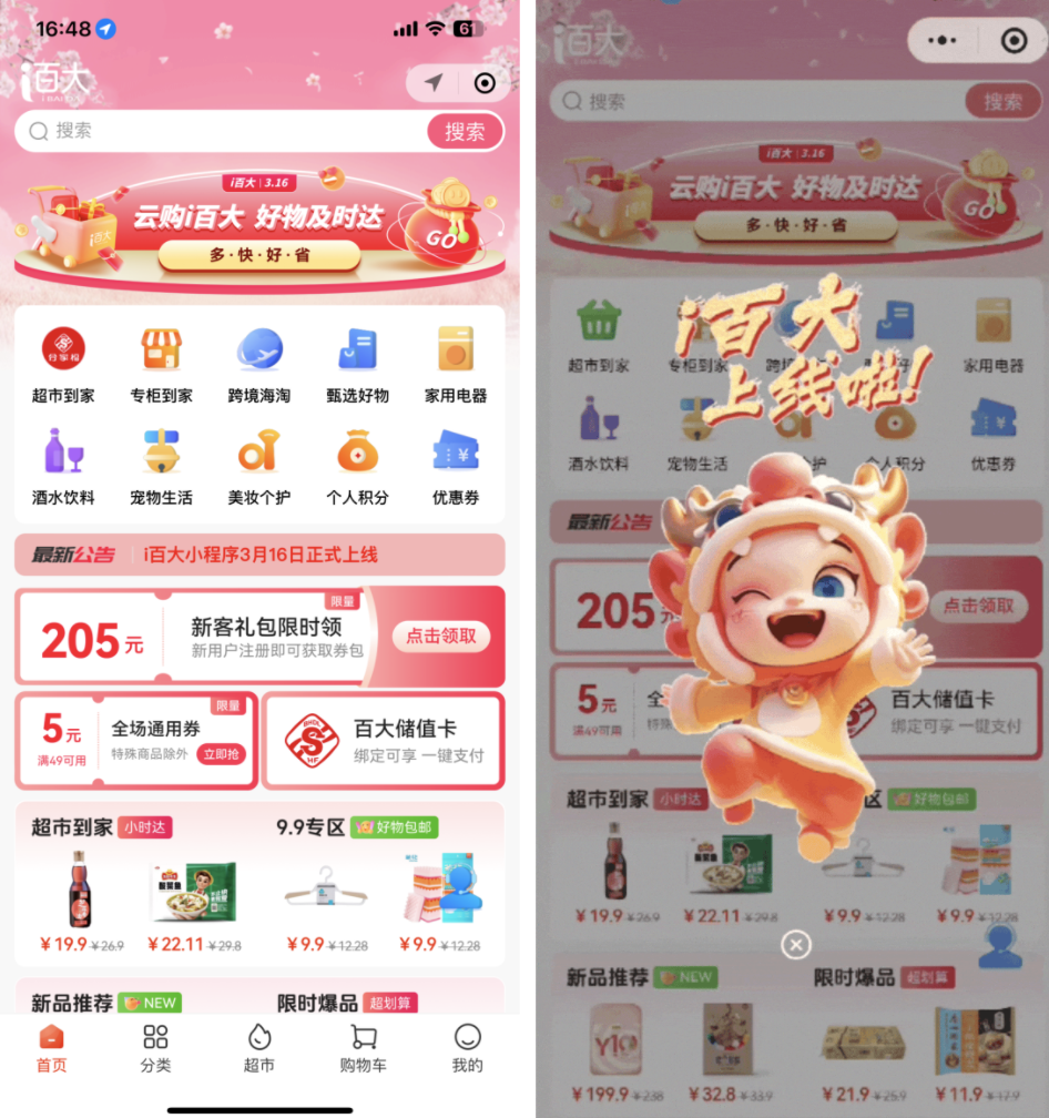 “i百大”項目的成功落地,標(biāo)志著合肥百大集團將全面實現(xiàn)多業(yè)態(tài)整合,通過一個平臺實現(xiàn)流量共用、商品共享和數(shù)據(jù)互通,開啟多業(yè)態(tài)融共進的全新格局!消費者只要打開微信/支付寶平臺搜索“i百大”,即可通過統(tǒng)一的入口,隨時隨地選購不同業(yè)態(tài)板塊中的商品好物,盡享多、快、好、省的“及時達”購物體驗。