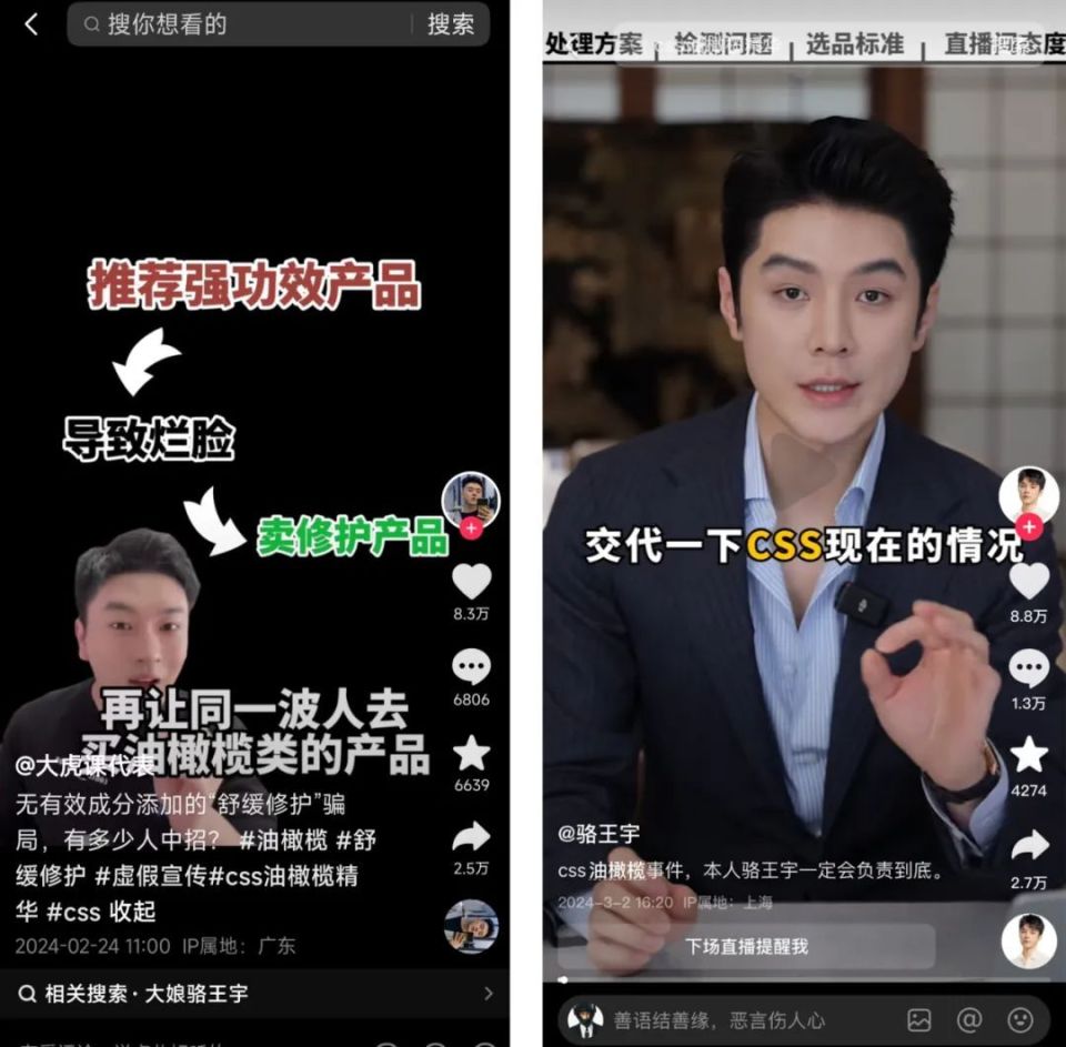 近期美妝圈還有一場網(wǎng)絡(luò)事件也頗耐人尋味。2月24日,抖音美妝達(dá)人“大虎課代表”將6款熱銷油橄欖精華產(chǎn)品送檢,其中CSS品牌(cosmetic skin solutions 希妍萃)油橄欖精華沒有檢出橄欖苦苷和羥基酪醇;“大虎課代表”喊話為該品牌帶貨的抖音知名美妝達(dá)人駱王宇。