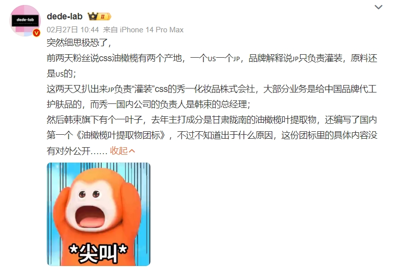 CSS油橄欖被網(wǎng)友扒出有美國和日本兩個產(chǎn)地,其中負(fù)責(zé)“灌裝”的“日本秀一化妝品株式會社”實際上大部分業(yè)務(wù)是給中國品牌做護(hù)膚品代工的,而秀一國內(nèi)公司的負(fù)責(zé)人竟然是國貨美妝集團(tuán)“韓束”的總經(jīng)理。