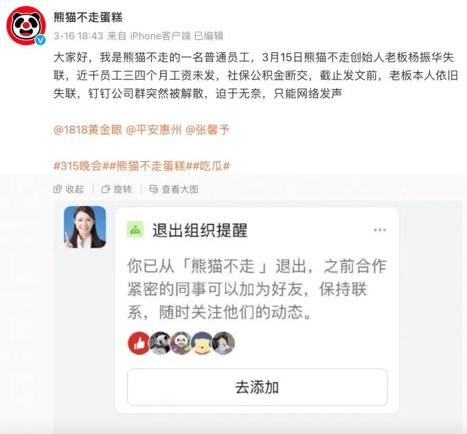 3月16日,熊貓不走蛋糕官方微博突然發(fā)布一則“員工討薪”內(nèi)容。