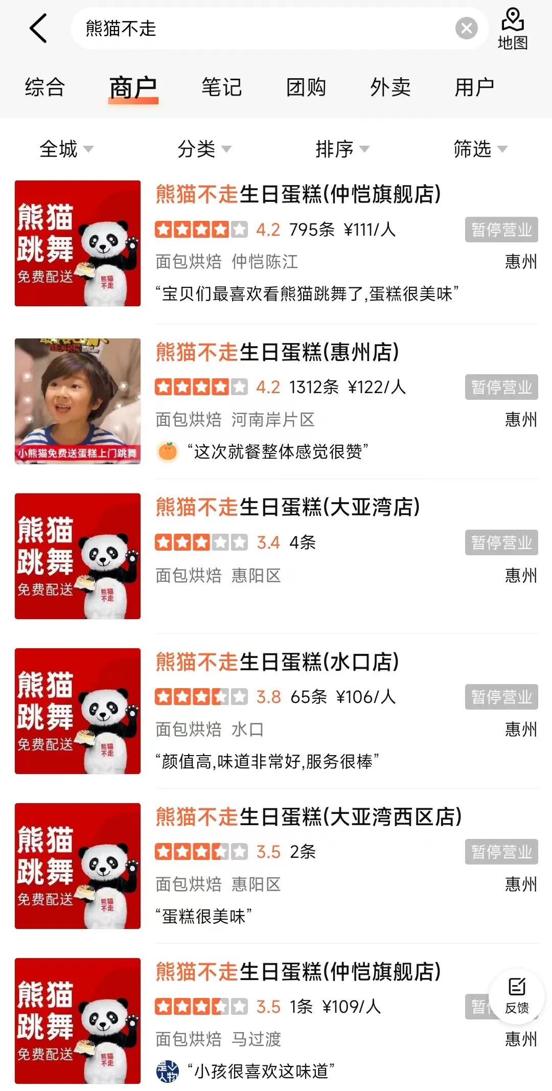 目前,熊貓不走蛋糕全國的網(wǎng)點(diǎn)均已經(jīng)“暫停接單”。另外,根據(jù)大眾點(diǎn)評網(wǎng),其全國的網(wǎng)點(diǎn)均顯示“暫停營業(yè)”。