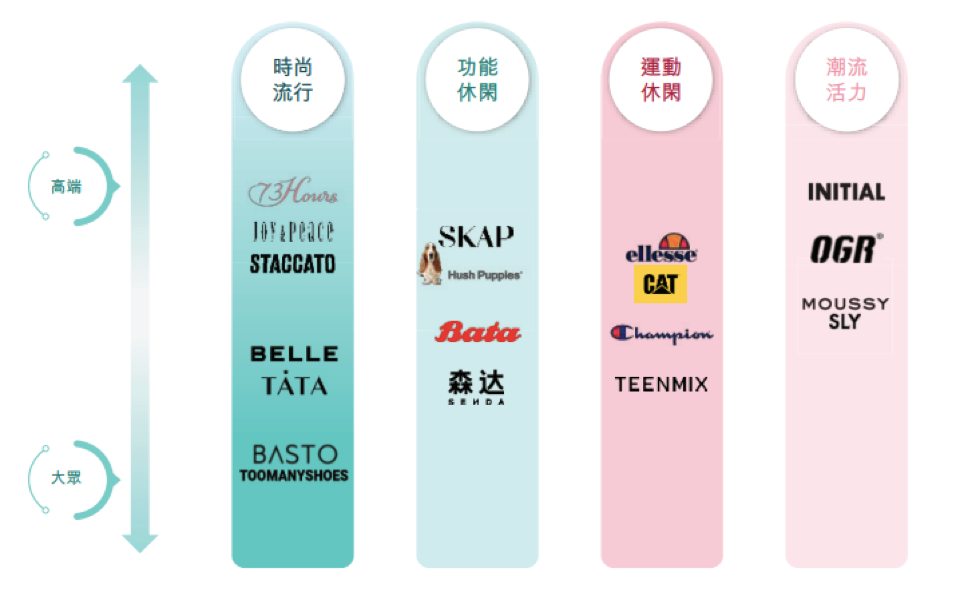 是的,單鞋履方面,我們在百貨商場一層所看到的BELLE、STACCATO(思加圖)、TATA(他她)、TEENMIX(天美意)、BASTO(百思圖)、SENDA(森達)、Joy&Peace(真美詩)等,都是百麗旗下所有。
