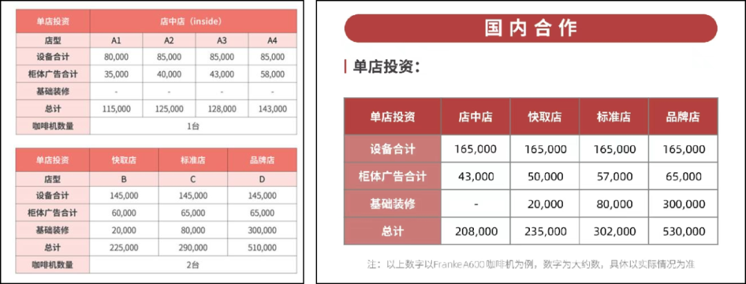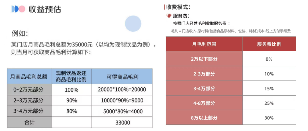 瑞幸成立很長一段時(shí)間,都采用直營,不開放加盟。后來陸正耀團(tuán)隊(duì)退出,2021年1月開始,開始采用「聯(lián)營模式」——零加盟費(fèi),加盟者只需要投入生產(chǎn)設(shè)備、裝修費(fèi)用等資金和保證金。盈利后,再階梯式抽成。