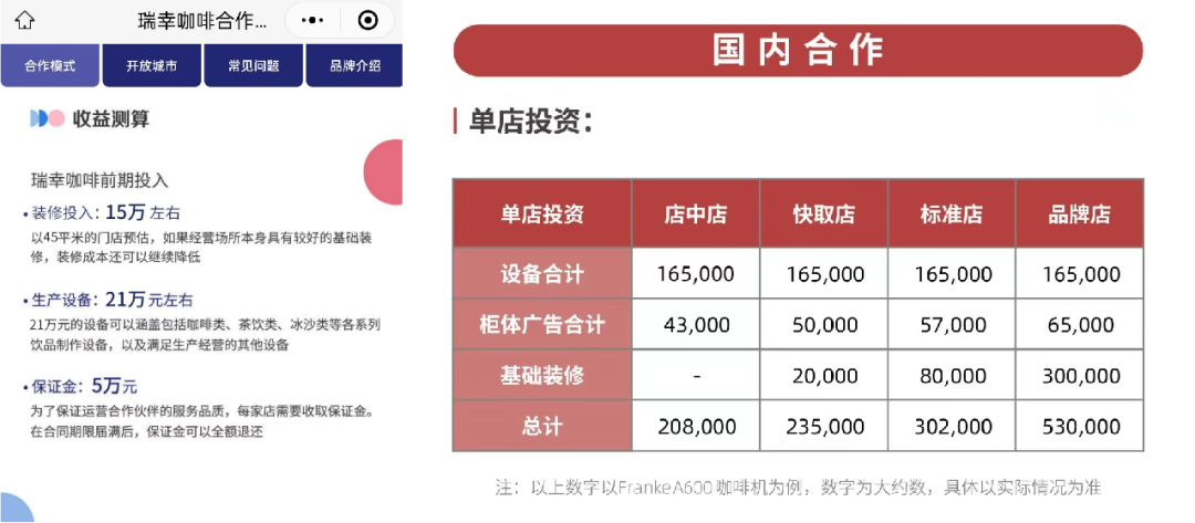 瑞幸(左)VS庫迪(右)聯(lián)營投入成本,數(shù)據(jù)來自官網(wǎng)截圖