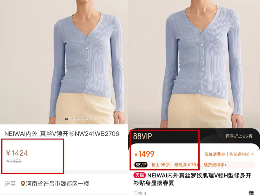從價格層面來看,胖東來線上購物的商品,價格并不便宜,但也沒有超出合理范圍。就一款真絲開衫的價格而言,獵云網(wǎng)對比了同款商品在淘寶旗艦店的售賣價格,二者相差不多。