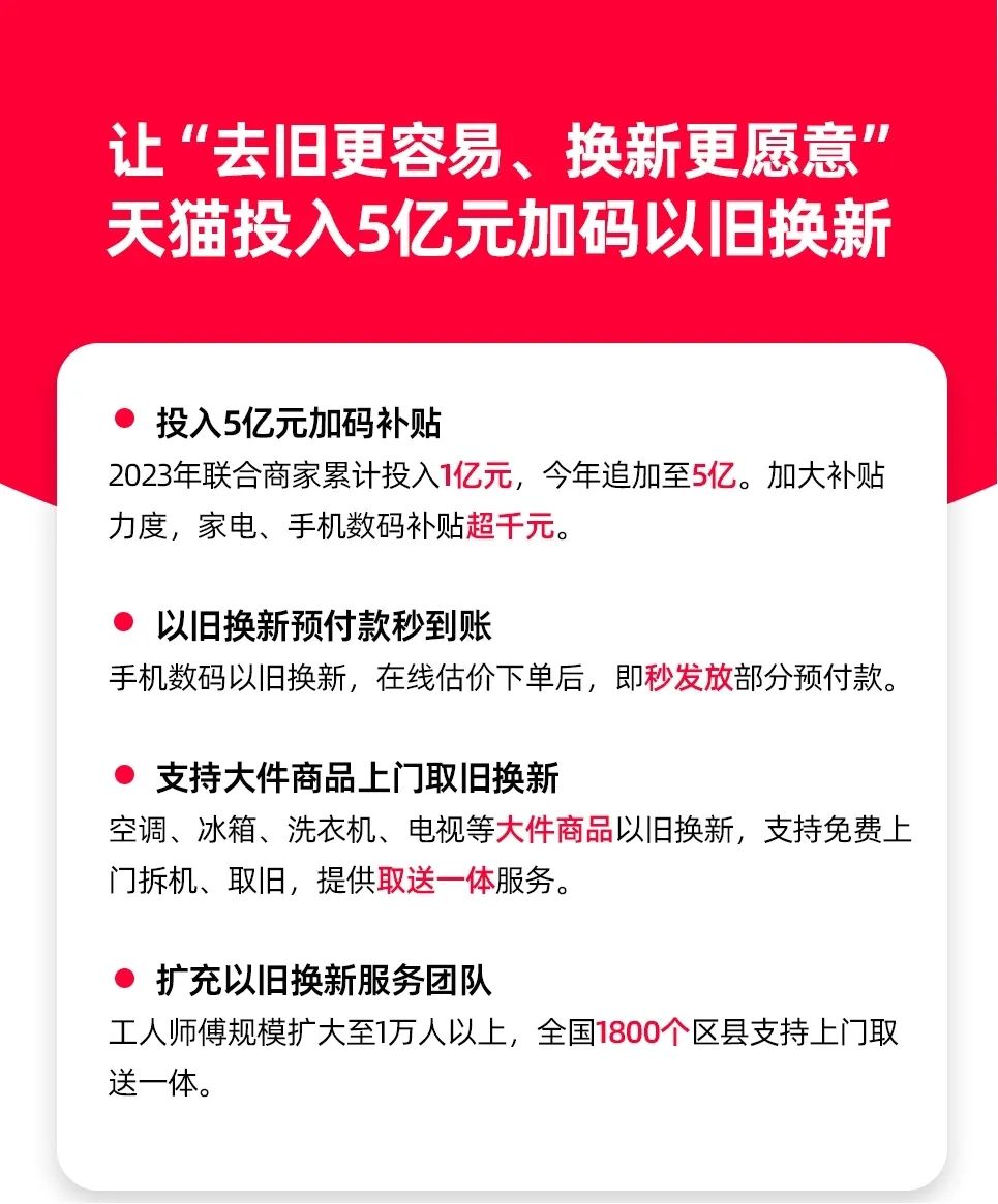 天貓方面,于3月8日宣布,2024年將聯(lián)合商家投入5億元加碼以舊換新補(bǔ)貼,擴(kuò)大補(bǔ)貼范圍與力度,并擴(kuò)充團(tuán)隊(duì)支持全國(guó)1800區(qū)縣大件商品上門送新取舊。同時(shí),以舊換新范圍將擴(kuò)展至家裝家居品類,新增商品超10萬(wàn)。