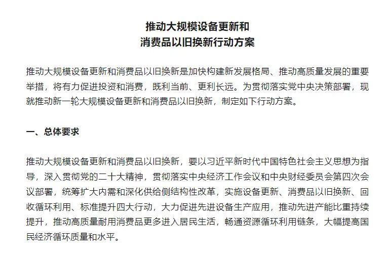 推動(dòng)大規(guī)模設(shè)備更新和消費(fèi)品以舊換新行動(dòng)方案