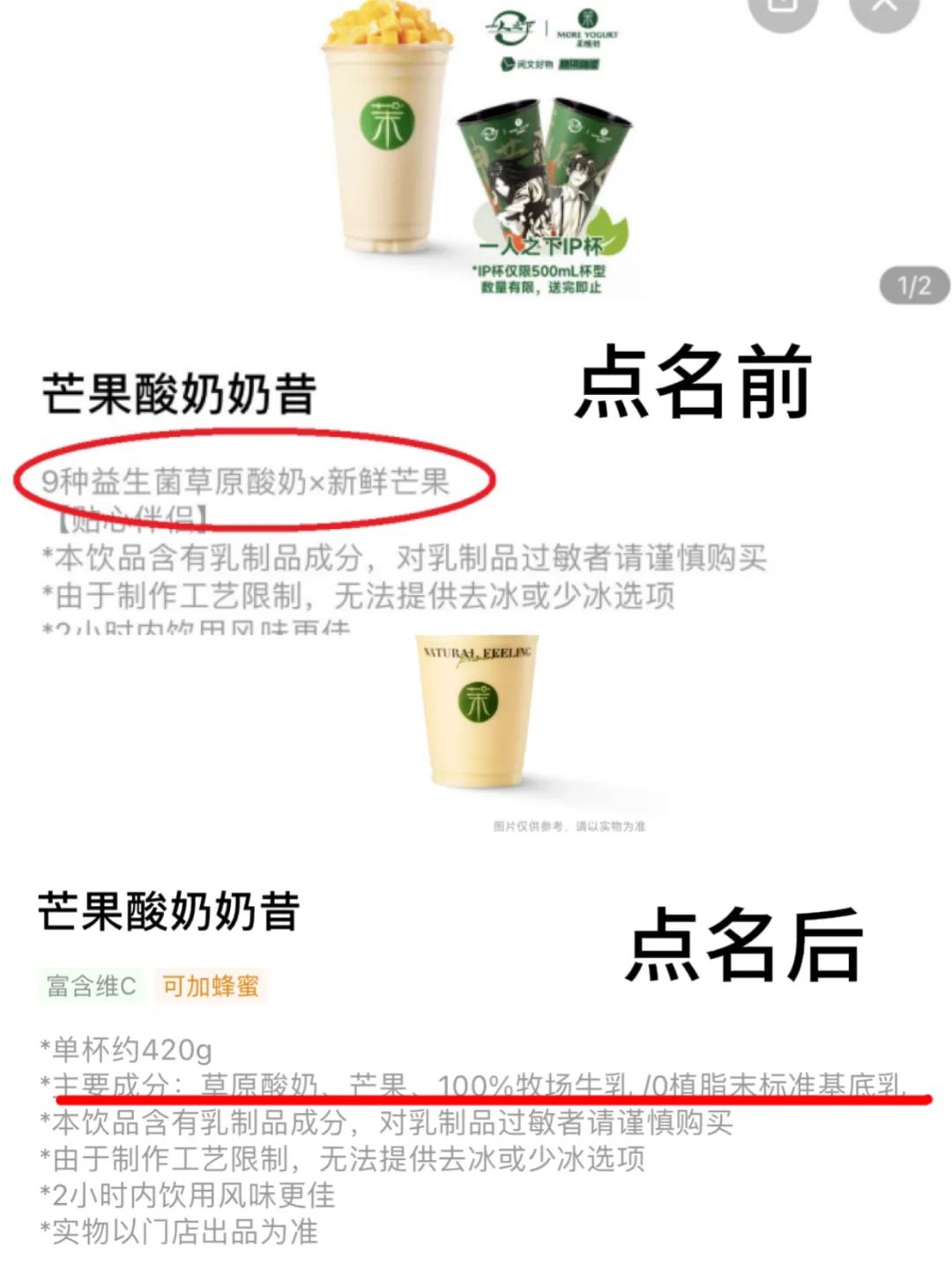 除此以外,壹覽商業(yè)觀察發(fā)現(xiàn),與點名前相比,茉酸奶“芒果酸奶奶昔”的配料表更加詳細,強調(diào)其原料的“純潔”。