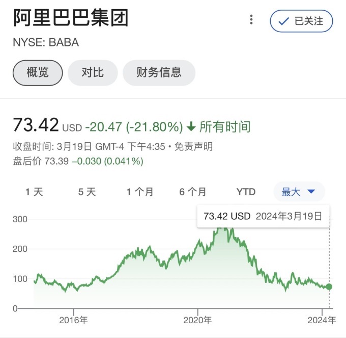 圖1 阿里巴巴的美股走勢(2014-2024)