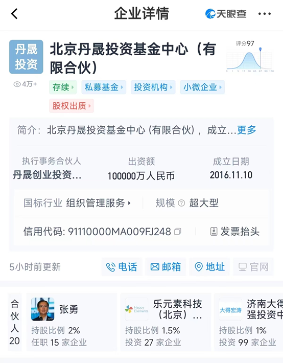 根據(jù)天眼查數(shù)據(jù)顯示,張勇在北京丹晟投資基金中心(有限合伙)擔任股東,出資比例2%,北京丹晟投資,成立于2016年,過去投資了唐吉坷德、連心醫(yī)療、數(shù)問科技等項目。