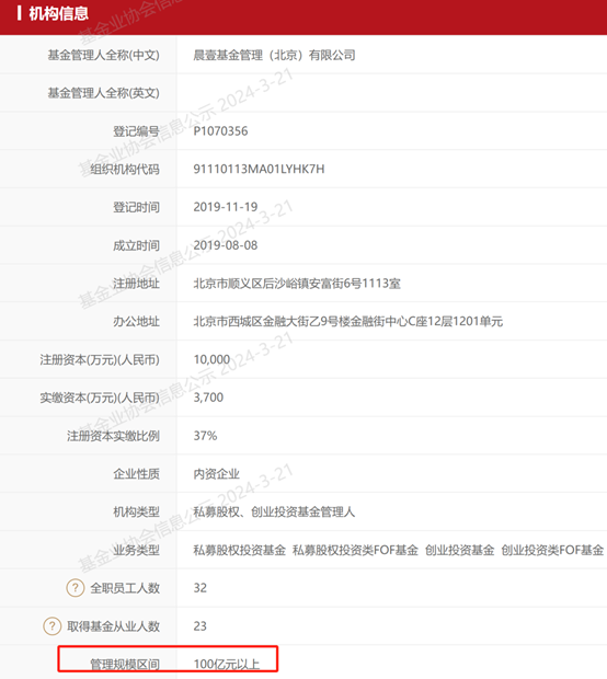 資料顯示,晨壹基金是由“并購女王”劉曉丹創(chuàng)立的私募機構(gòu),于2019年8月8日成立,并在2019年11月19日完成私募股權(quán)、創(chuàng)業(yè)投資基金管理人備案登記;饦I(yè)協(xié)會網(wǎng)站信息顯示,晨壹基金目前有32名全職員工,管理規(guī)模在100億元以上。