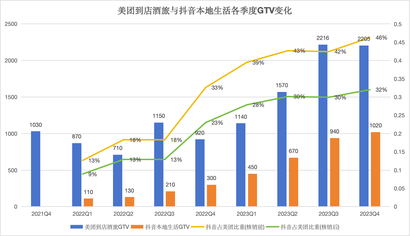 美團(tuán)到店酒旅與抖音本地生活各季度GTV變化 數(shù)據(jù)來源:公開資料、財(cái)報(bào)