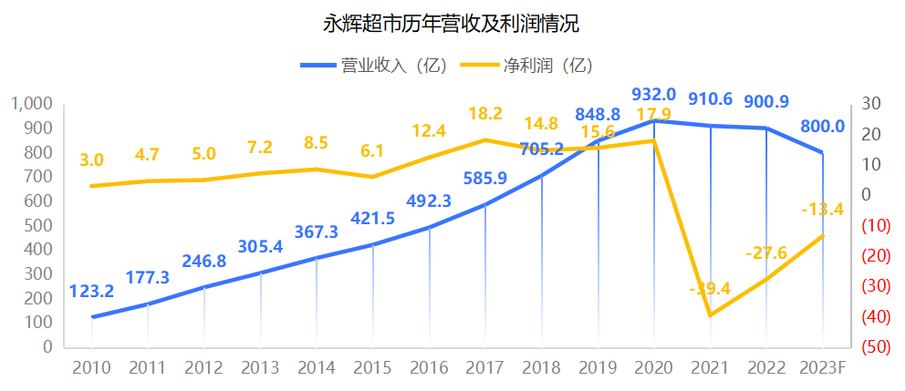 隨著疫情的沖擊及整體消費市場的變化,2021年,永輝一下子爆出了巨額虧損,永輝年報解釋為疫情及社區(qū)團購低價擴張影響,公司在商譽及閉店方面提取了減值準備,此后的三年,永輝銷售下滑,利潤進入虧損通道。