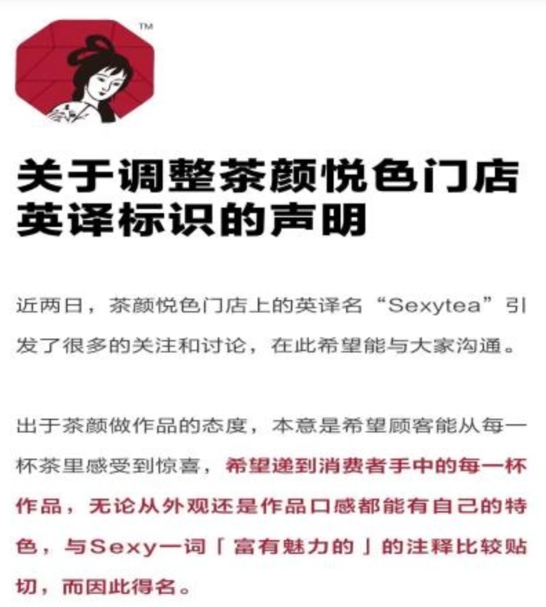 一方面,“Sexy Tea”與茶顏悅色本身的品牌調(diào)性并不匹配,將品牌名如此翻譯,完全不符合信達雅的翻譯標準;另一方面,茶顏悅色的logo是一位手持絹扇、柳葉細眉、輕輕頷首、充滿東方古典美的仕女,這樣的logo和洋氣的“Sexy”放在一起明顯無法匹配,甚至會引發(fā)一些低級趣味聯(lián)想。