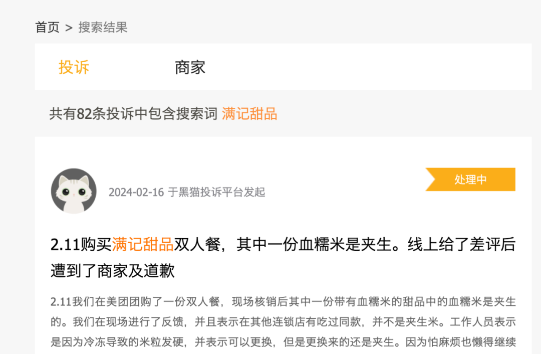 不過(guò)在黑貓投訴平臺(tái),滿記甜品有著統(tǒng)一的回應(yīng)話術(shù):“您的需求已轉(zhuǎn)交客服專(zhuān)員,我們將盡快聯(lián)系您處理。”這并未解決實(shí)際問(wèn)題。